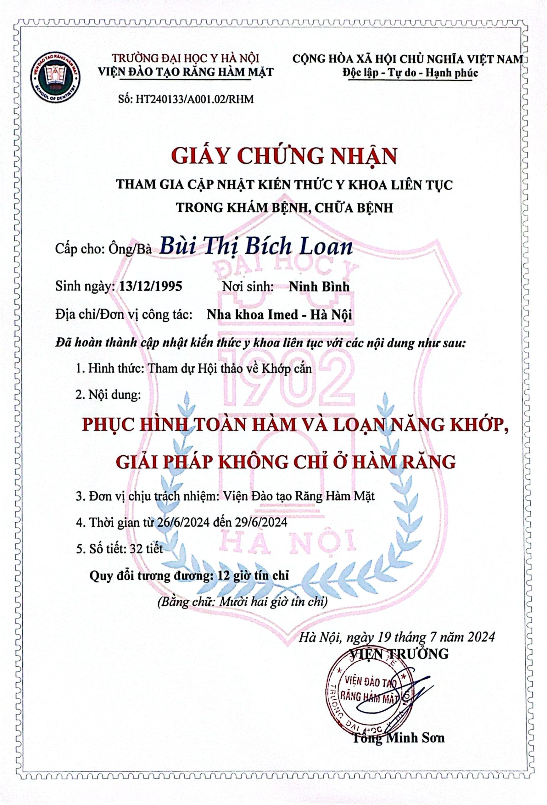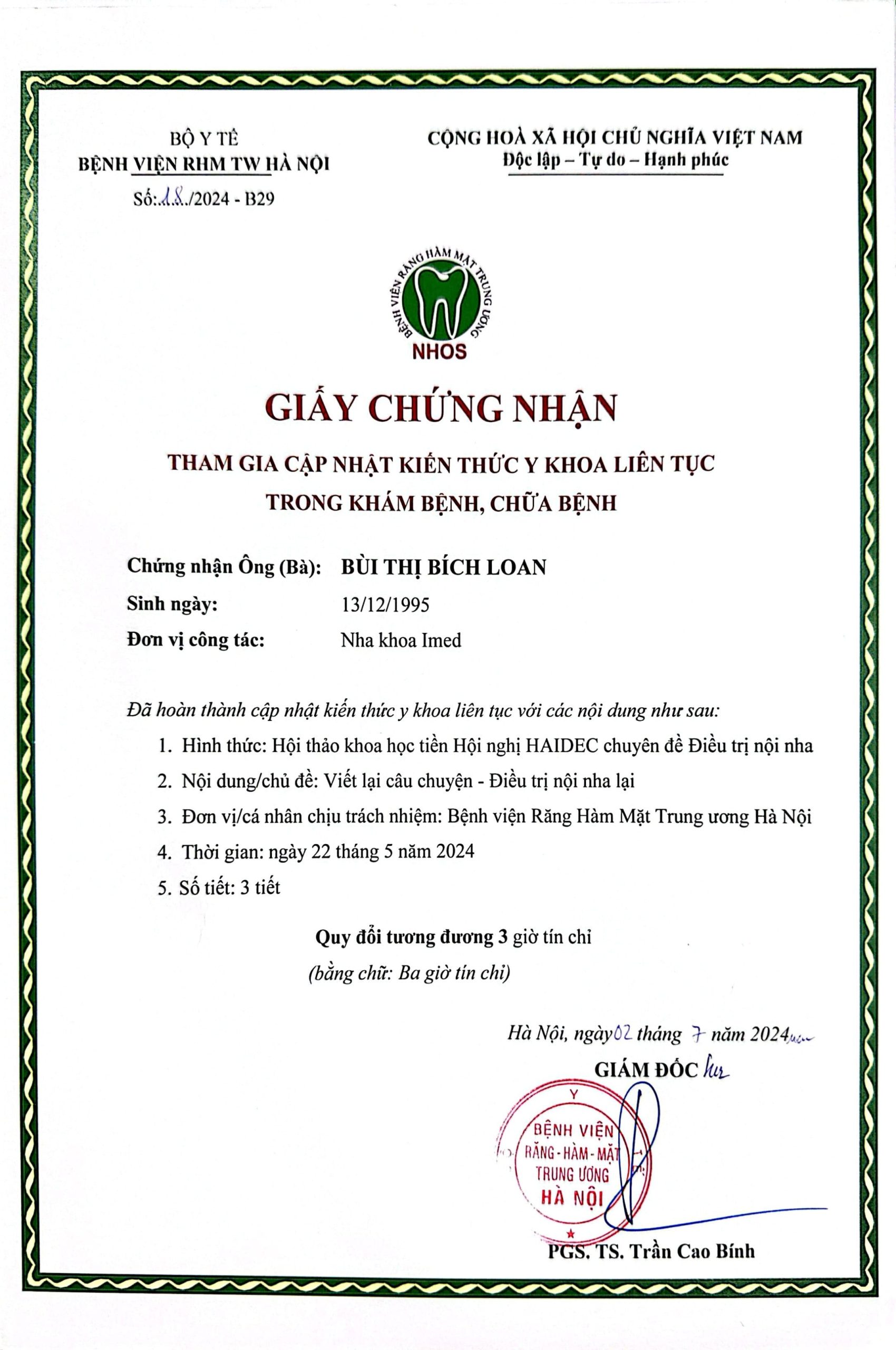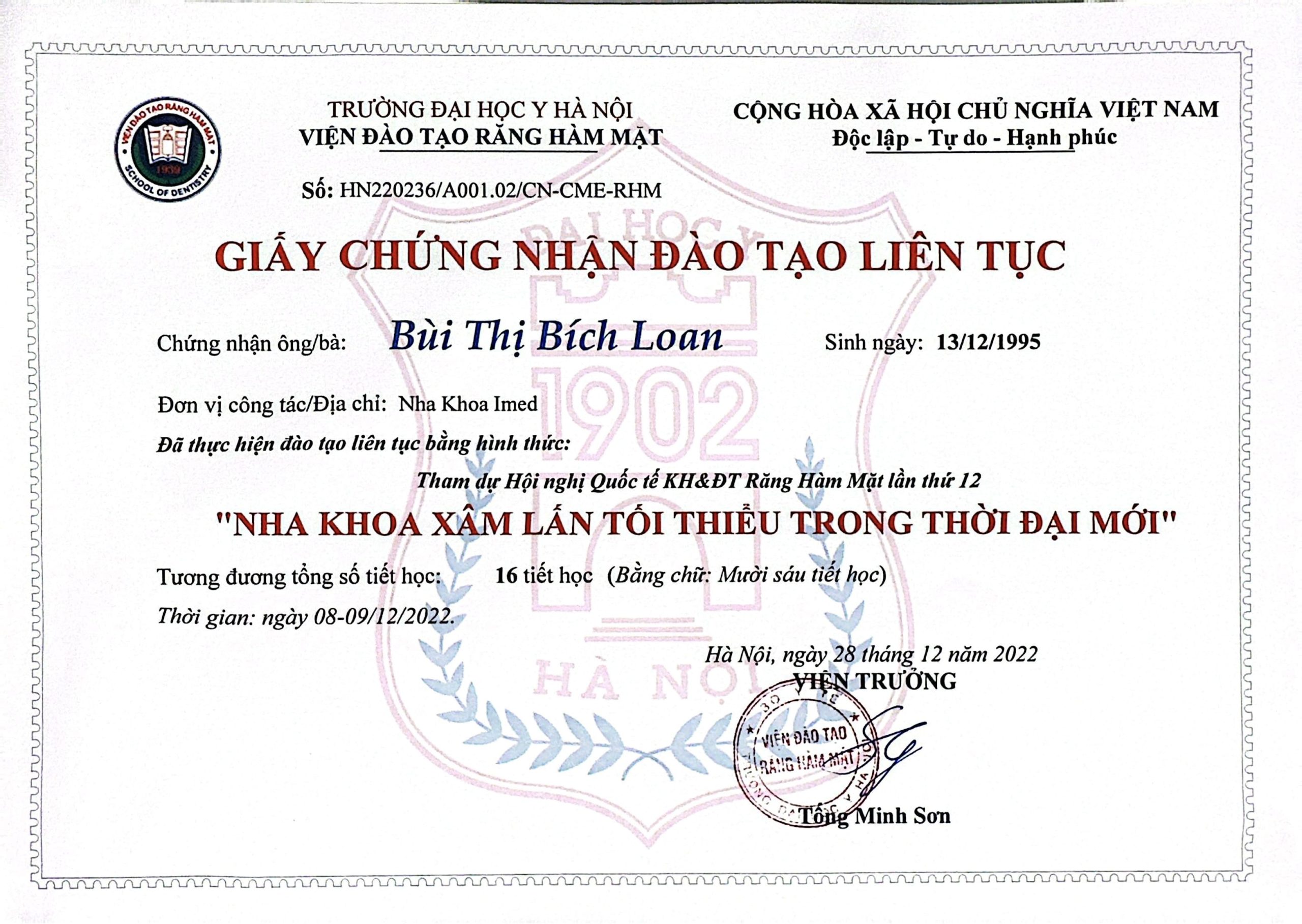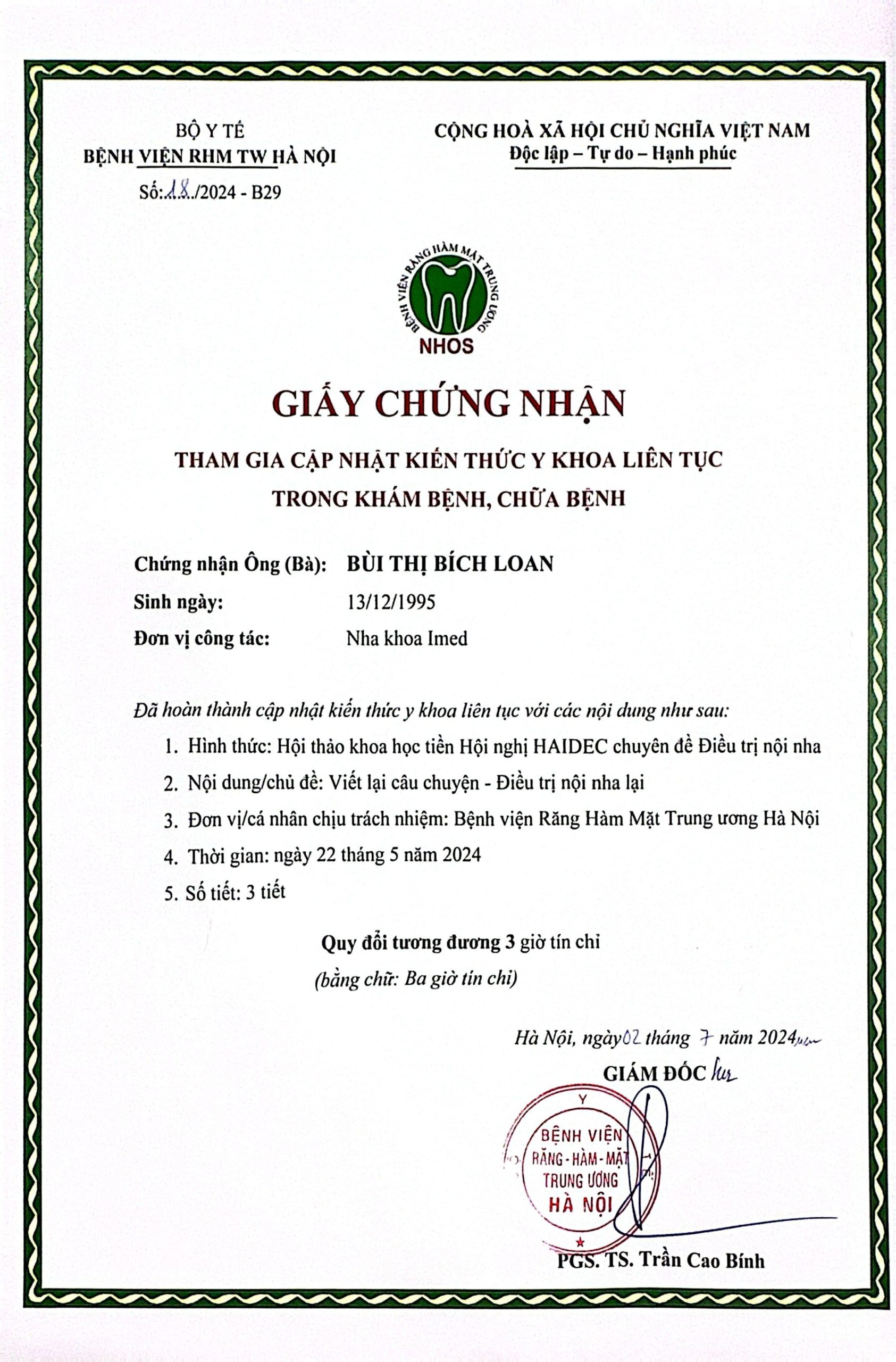- 2020: Khóa đào tạo nội nha Viện răng hàm mặt Đại học Y, Hà Nội